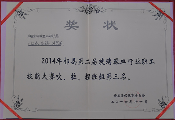2014年被“中國日用玻璃協會授予高腳帝王杯、公爵杯榮譽稱號”